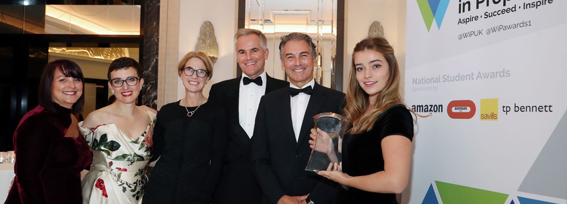 Pictured above (left to right): Nicola Jones, National Chair with national sponsors Katia Polidoro tp bennett, Carole Ditty Bouygues, Ian Maxwell Savills and Francesco Nucera Amazon with Talluah Bannerman, winner of 2022 National Student Awards